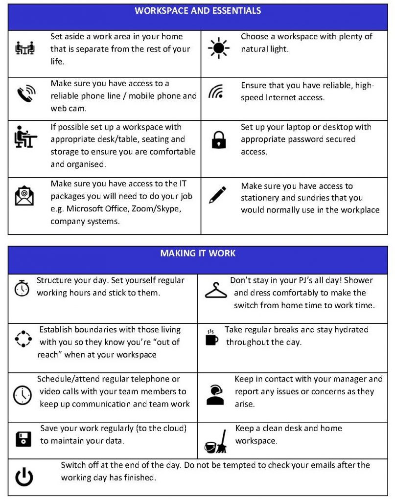 With the government directive to ‘only go to your job if you cannot work from home’ a huge swathe of the UK workforce will this week be adapting to a temporary shift to working from home.  For many this represents a complete change to the normal working week and there will be some adjustments needed to stay healthy, productive and connected whilst working separately to comply with the social distancing directive. Here are some key ideas for you and your employees to consider to make the transition as smooth as it can be.
